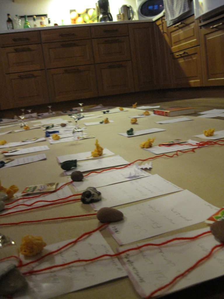 Nachdem ich alles chronologisch angeordnet hatte, ging ich noch etwas davor auf und ab, betrachtete die Abläufe, stimmte sie mit der Planung im Computer ab. Dabei wurden mir selbst einige Bezüge und Wendungen erst richtig klar – sowas lässt sich dann schnell mit Kreide notieren. Am Ende drapierte ich den roten Faden, damit ich beim Schreiben keine Szene vergesse. Das Ungeheuer tauchte übrigens von selbst an der richtigen Stelle auf – und morgens lächelt es mich voll Tatendrang an, wenn ich aus dem Schlafzimmer komme 🙂