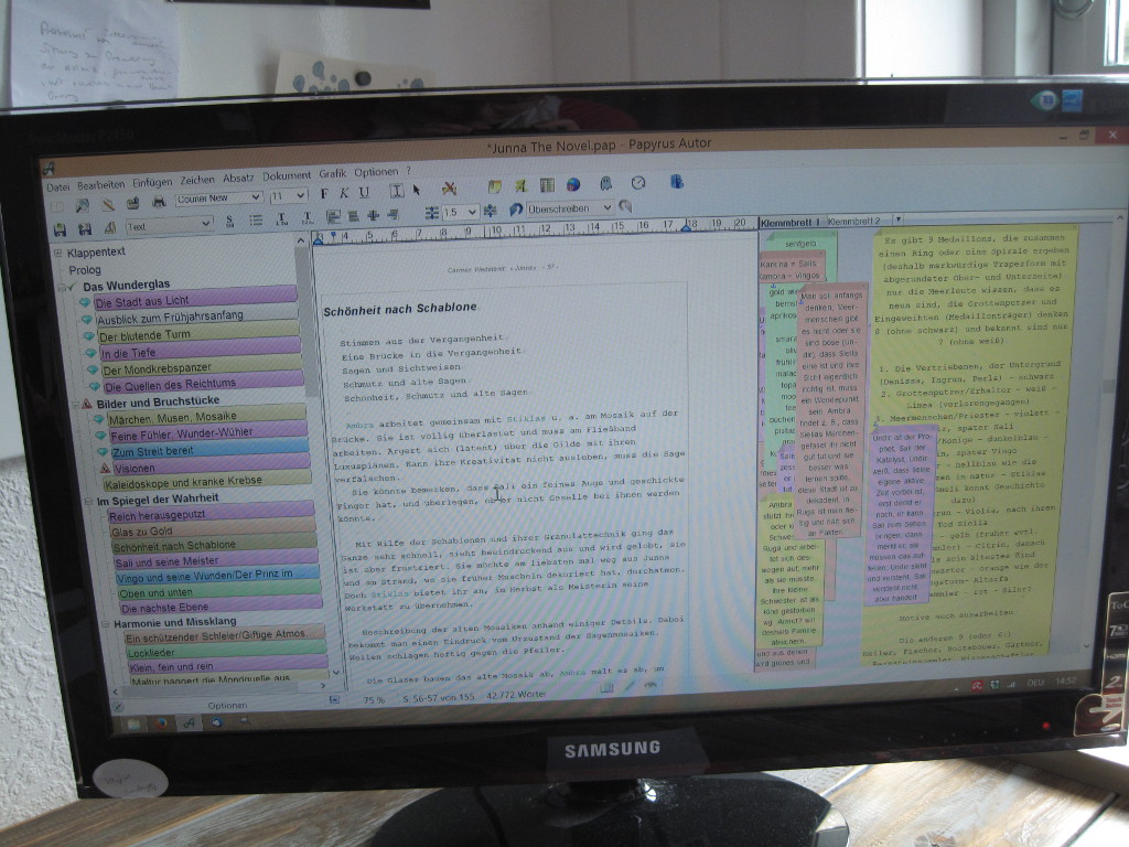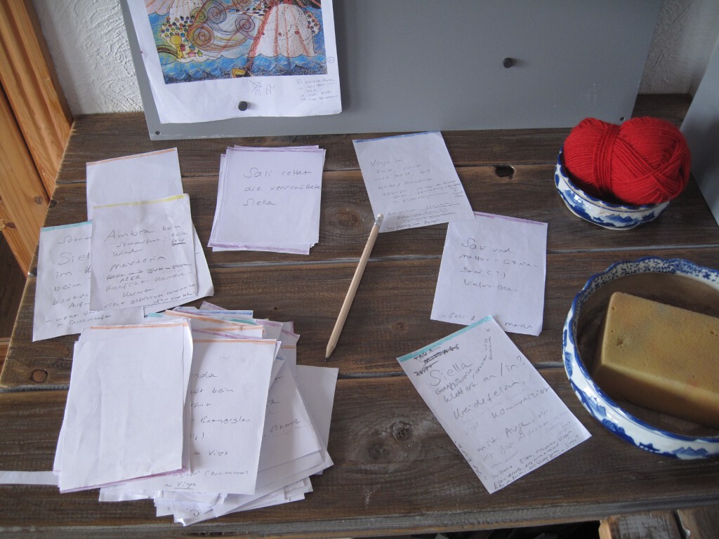 Irgendwann kam ich darauf, alle wichtigen Handlungsbestandteile auf kleine Zettel zu schreiben. So à la „Hauptfigur kommt am Schauplatz an“, „das Geheimnis der Insel wird gelüftet“, „die Welt steht kurz vorm Untergang“ usw. Es wurden unglaublich viele Zettel, es ging unglaublich langsam, aber mir half es, das Material in der Hand zu haben, es durchzuarbeiten, herumzuschieben. So fiel mir etwa auf, dass ich viele Elemente fusionieren konnte: Aus „das Geheimnis der Insel wird gelüftet“ und „die Welt steht kurz vorm Untergang“ ließ sich zum Beispiel eine Szene machen. Schließlich hatte ich 60 Zettel, jeder beschreibt in ein bis vier Sätzen eine Szene meines Handlungsentwurfs. (Eine Szene ist eine Einheit, die aus der Perspektive einer Figur geschrieben ist, mehrere Szenen bilden bei mir ein Kapitel.) Ich habe die Szenen je nach Perspektivfigur farbig markiert.
