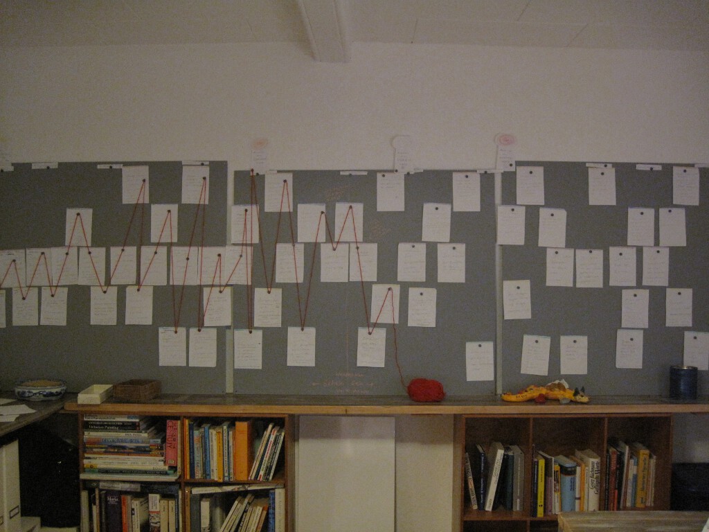 Mir hilft es tatsächlich, die Szenen anzufassen, sie herumzutragen, vor der Geschichte auf- und abzugehen und so den eigenen Standpunkt zu wechseln. Je mehr Sinne man einsetzt, desto kreativer wird man! Es hat Spaß gemacht, und der Anblick erinnert mich täglich daran, für was ich eigentlich hier bin. Und wenn Besuch kommt, machen drei Meter Handlungsplan einfach was her 🙂