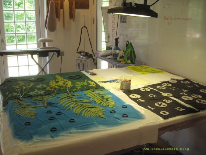 Man breitet die Stoffe auf einer geeigneten Unterlage aus und steckt sie am besten mit Nadeln fest, damit sie glatt liegen. Man besprüht die Stoffe mit Wasser, damit sie leicht feucht sind. Danach bemalt man sie mit Textilfarbe (wir verwendet Farben und Bindemittel von Uniprint; ich weiß leider nicht, wie die Materialien in Deutschland heißen). Anschließend legt man die Pflanzenteile auf den Stoff und fixiert kritische Stellen mit Stecknadeln, damit sie sich nicht vom Stoff lösen.