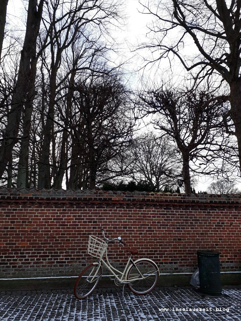 Winterbilder aus Dänemark Fahrrad vor Friedhofsmauer in Roskilde 09/06/2018 / Carmen Wedeland - inselauszeit.blog